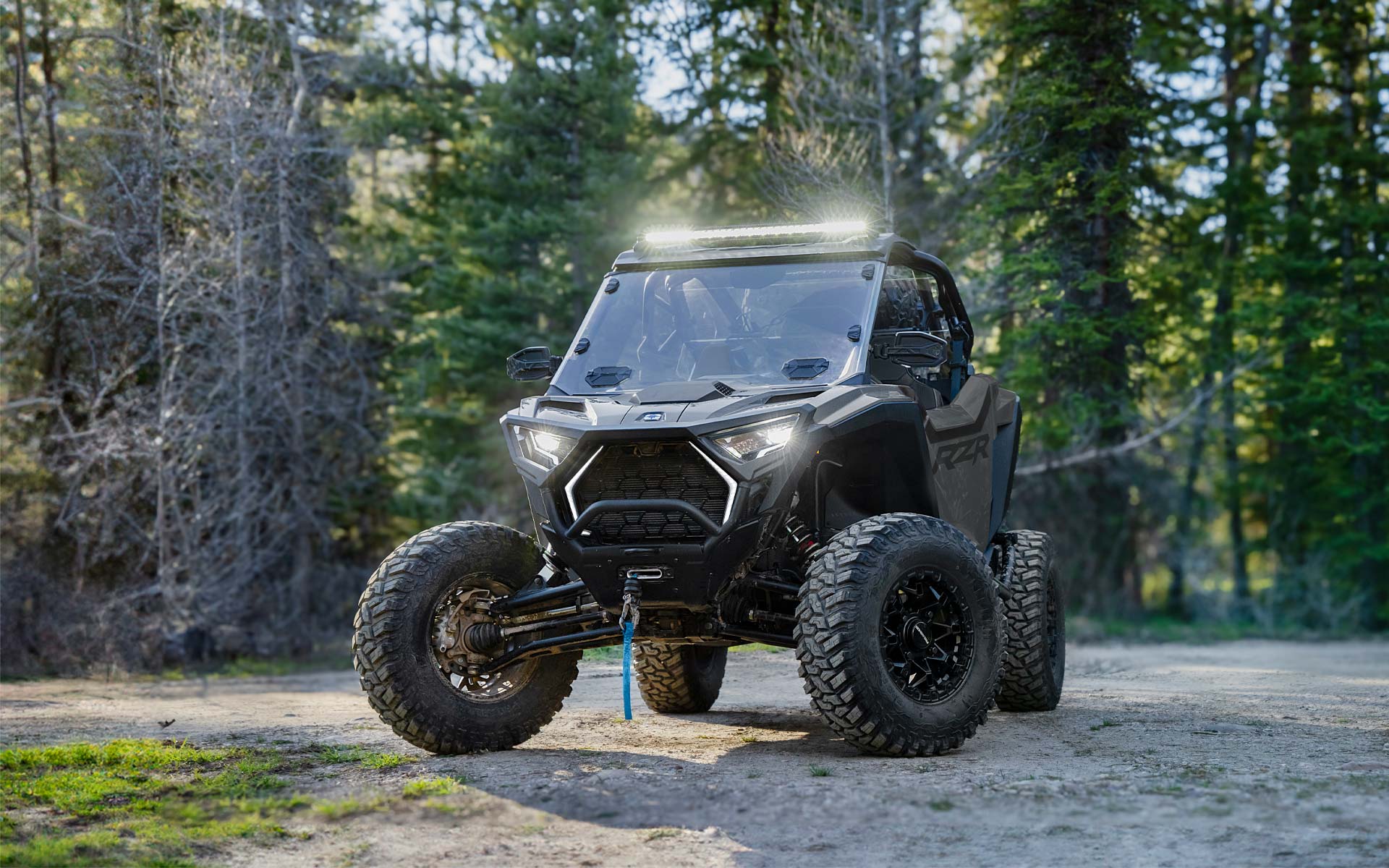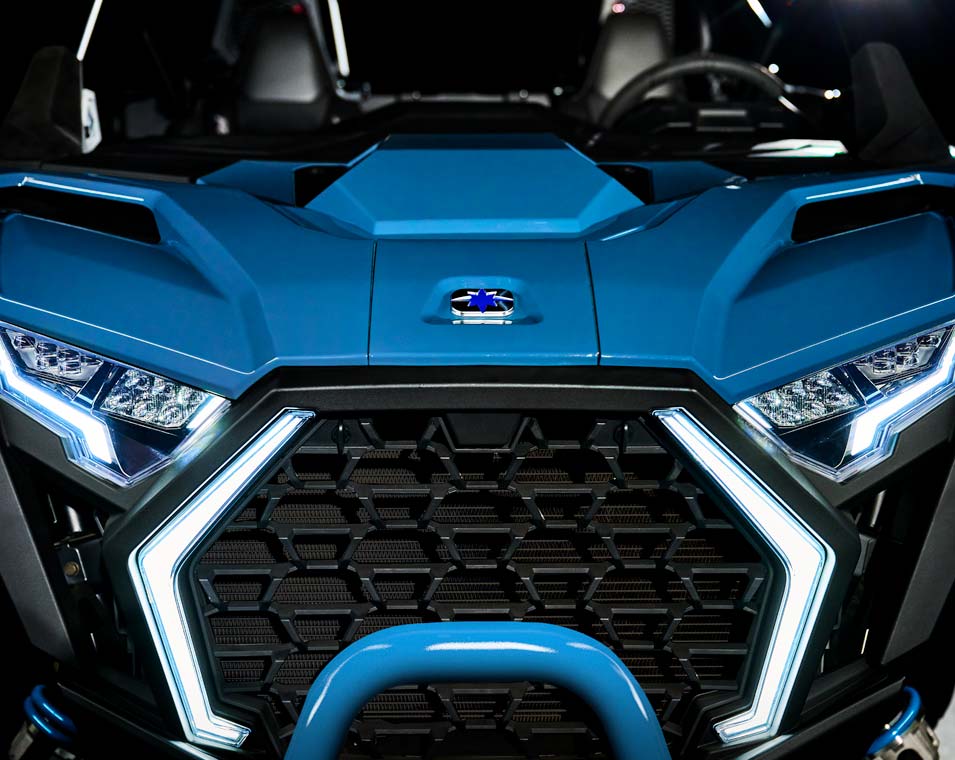 Signature RZR Fang-Akzentbeleuchtung; weiße LED-Abblend- und Fernlichter sowie rote LED-Rück- und Bremslichter; animierte Innenraumbeleuchtung