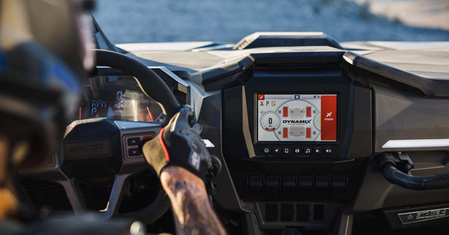 Fahrerorientiertes Informationsdisplay mit 10,2 cm (4") Farbdisplay + Drehzahlmesser & Tachometer, programmierbare Serviceintervalle, Tachometer, Drehzahlmesser, Kilometerzähler, Tageskilometerzähler, Uhr, Betriebsstundenzähler, Ganganzeige, Tankanzeige, Kühlmitteltemperatur, Voltmeter, Serviceanzeige und -codes, Anschnallerinnerung, DC-Steckdose, Polaris P.A.S.S. Diebstahlschutzsystem
